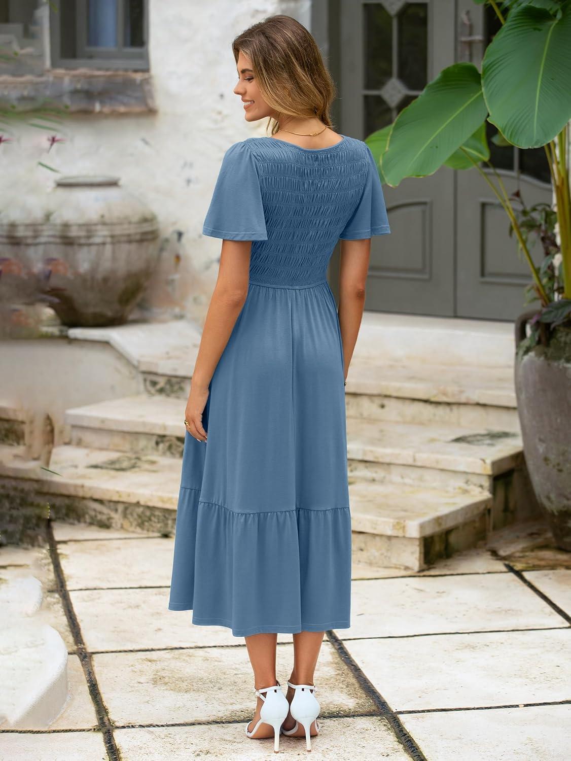 Simplee Womens Summer Smocked Flowy Dress – Casual Flutter Sleeve Tiered Boho Maxi Dresses with Pockets(Dusty Blue)