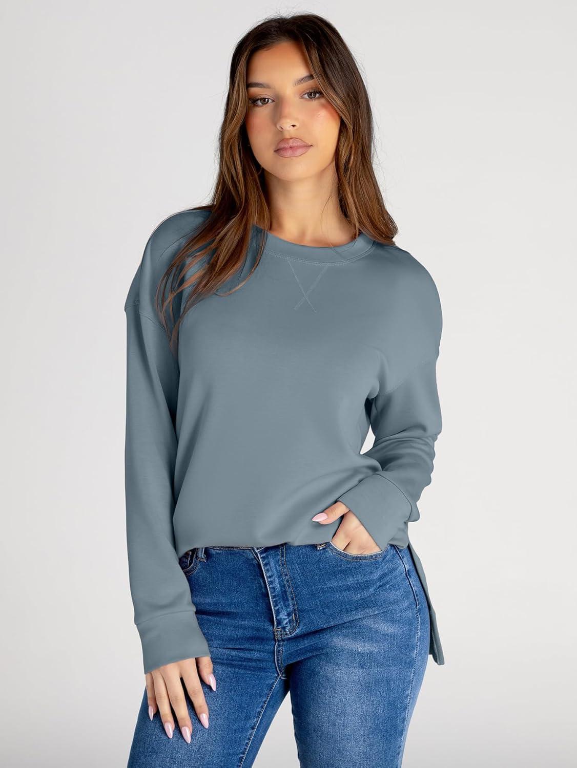 Simplee Womens Sweatshirt Long Sleeve Crewneck Striped Sweatshirt for Women 2024 Trendy Fall Tops Pullover Sweatshirts(Solid-grey Blue)