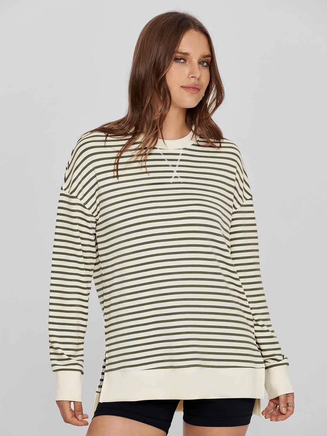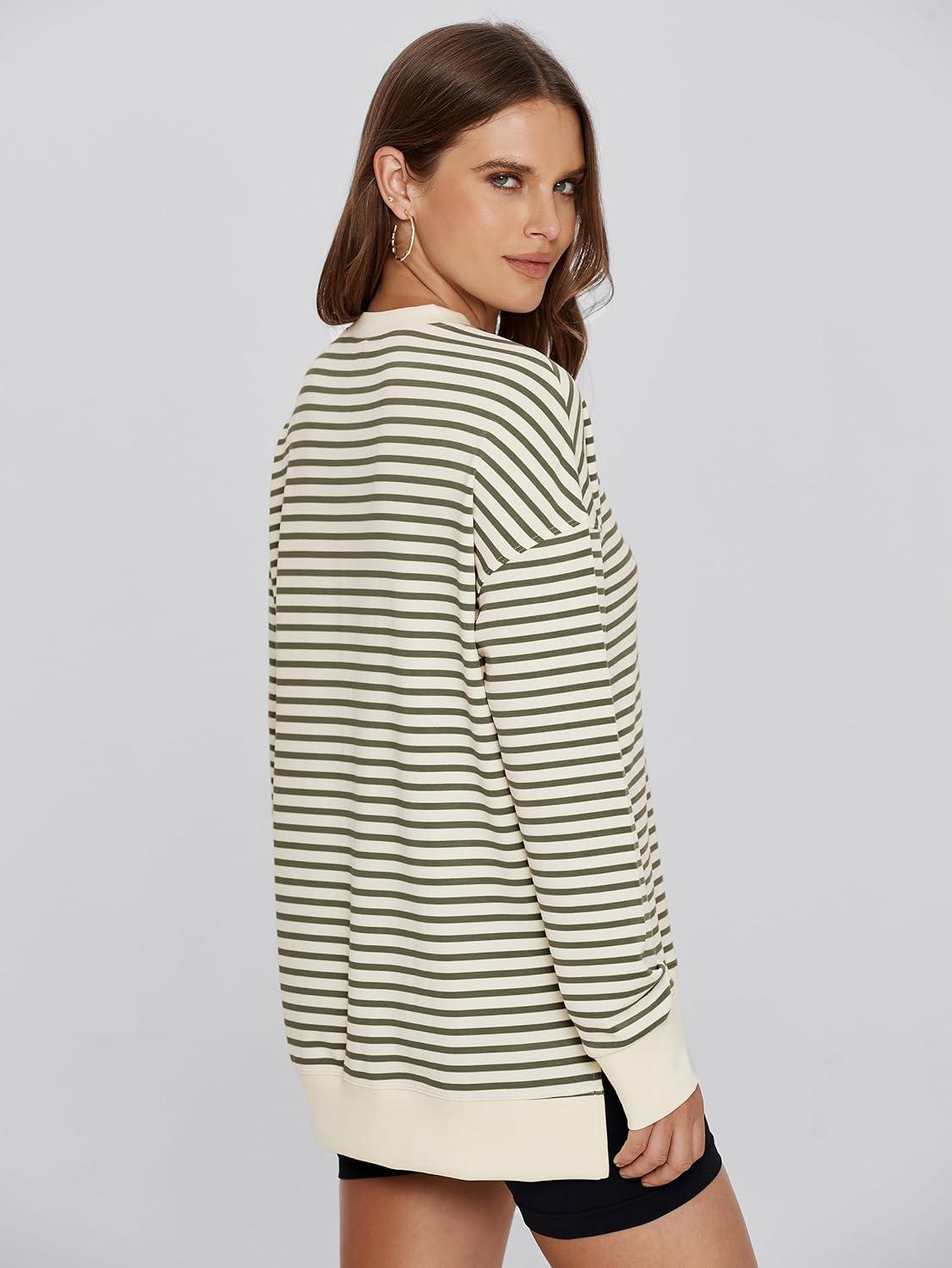 Simplee Womens Sweatshirt Long Sleeve Crewneck Striped Sweatshirt for Women 2024 Trendy Fall Tops Pullover Sweatshirts(Striped-army Green)