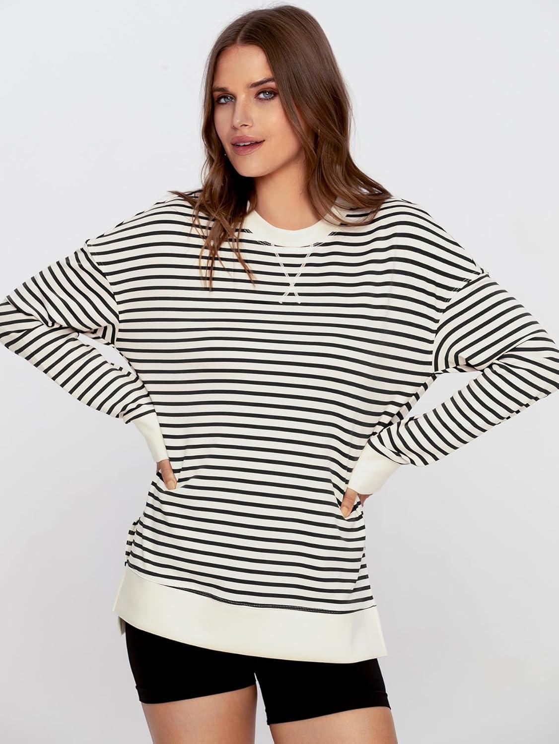 Simplee Womens Sweatshirt Long Sleeve Crewneck Striped Sweatshirt for Women 2024 Trendy Fall Tops Pullover Sweatshirts(Striped-black)