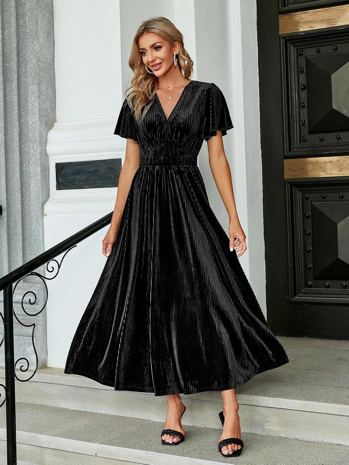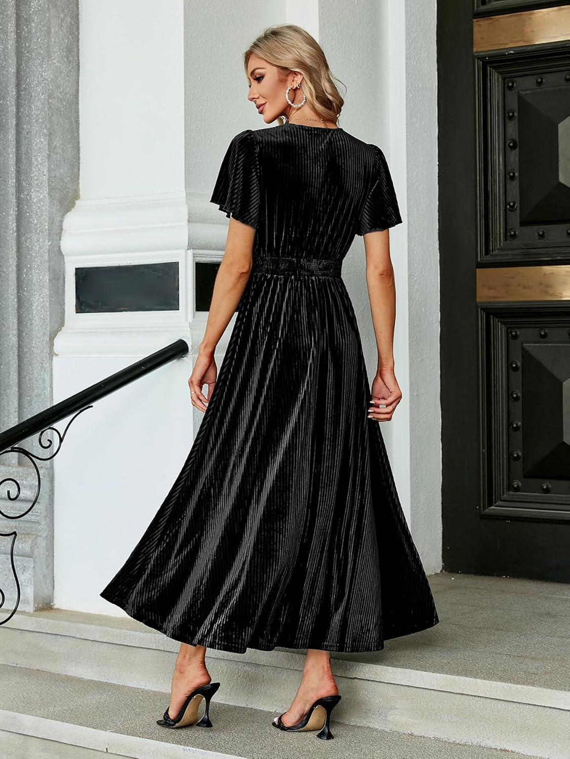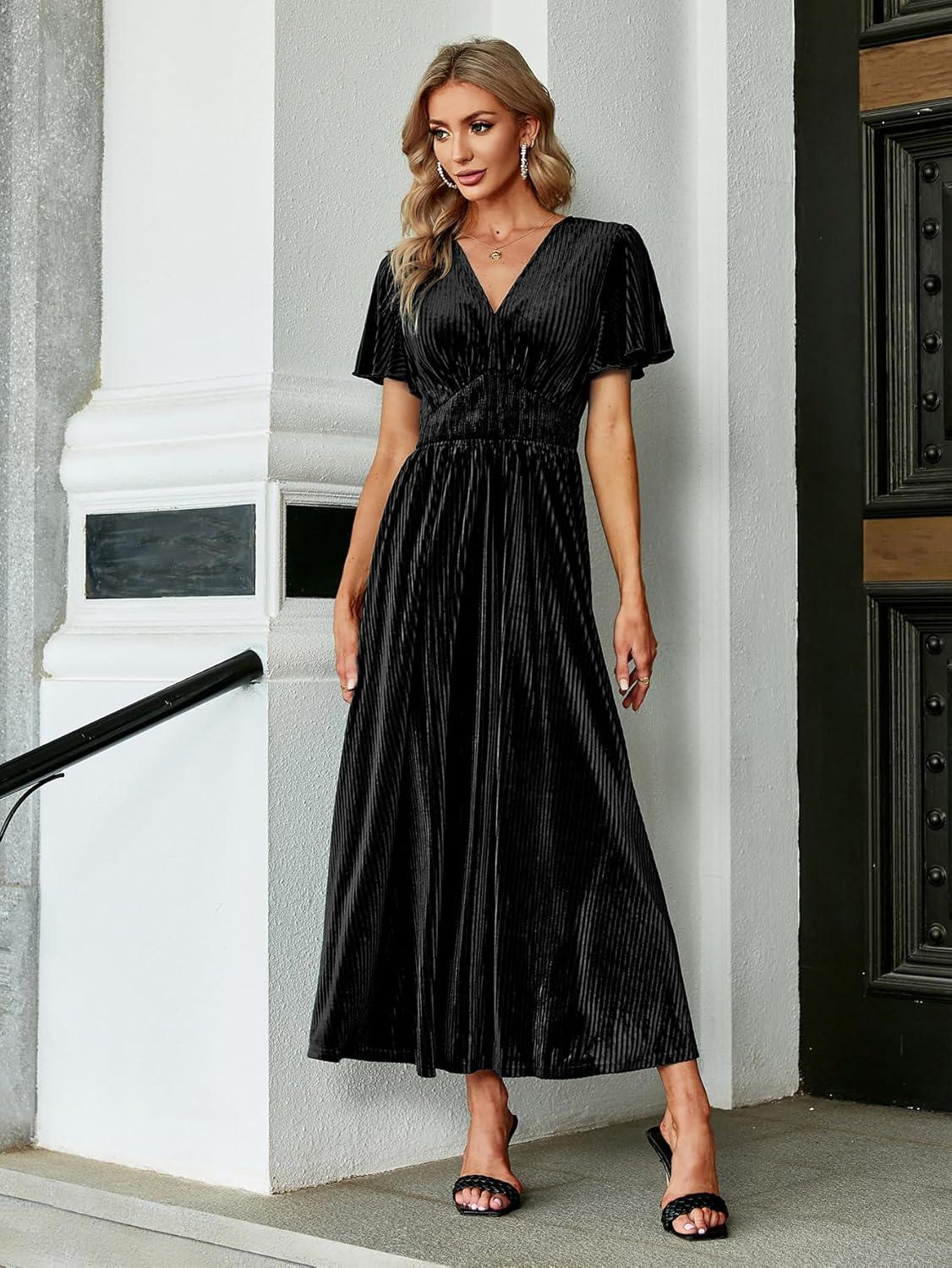 Simplee Women’s V Neck Velvet Maxi Dress Short Sleeve Empire Waist Long Formal Dress for Wedding Guest(4#black)