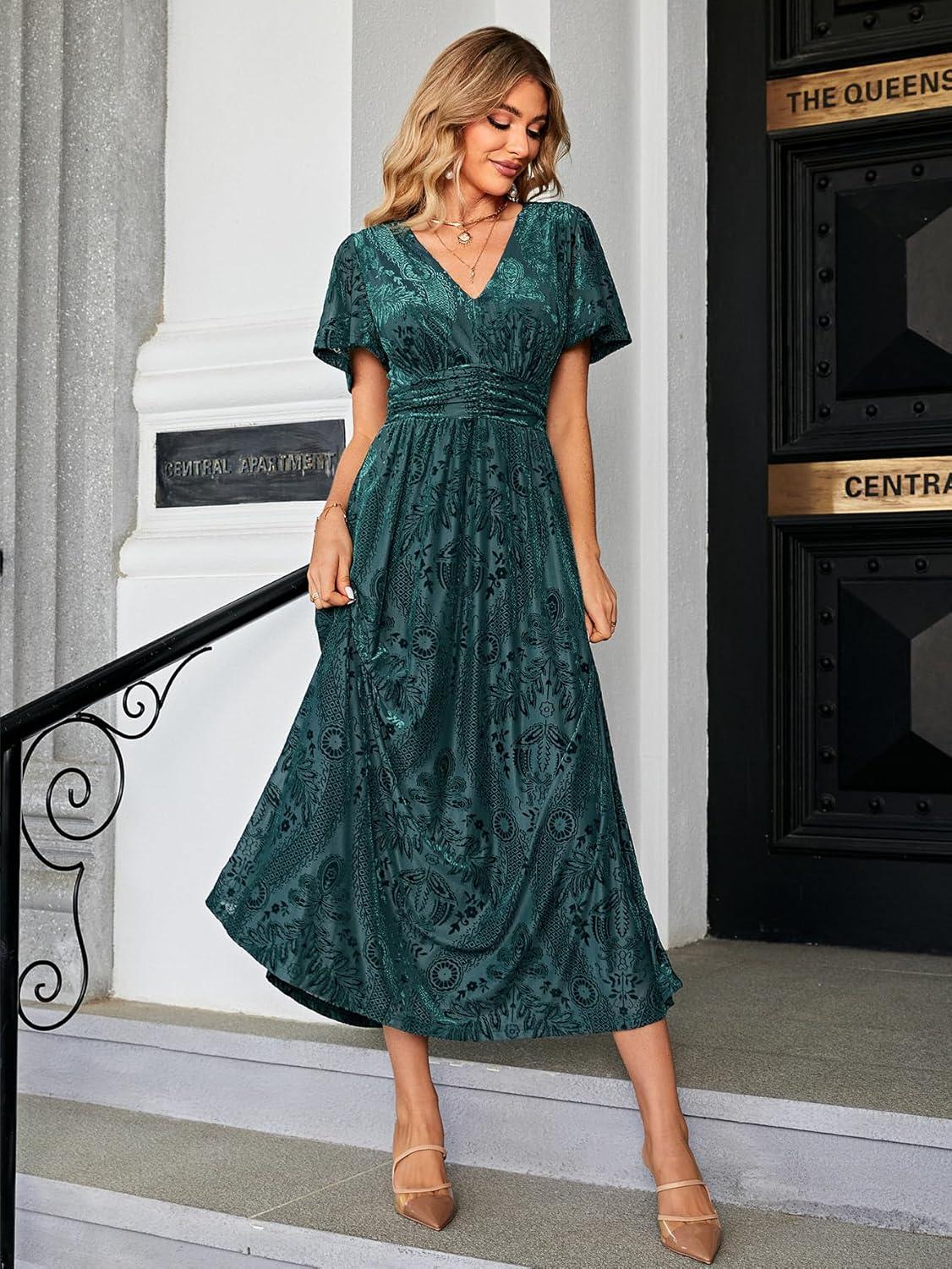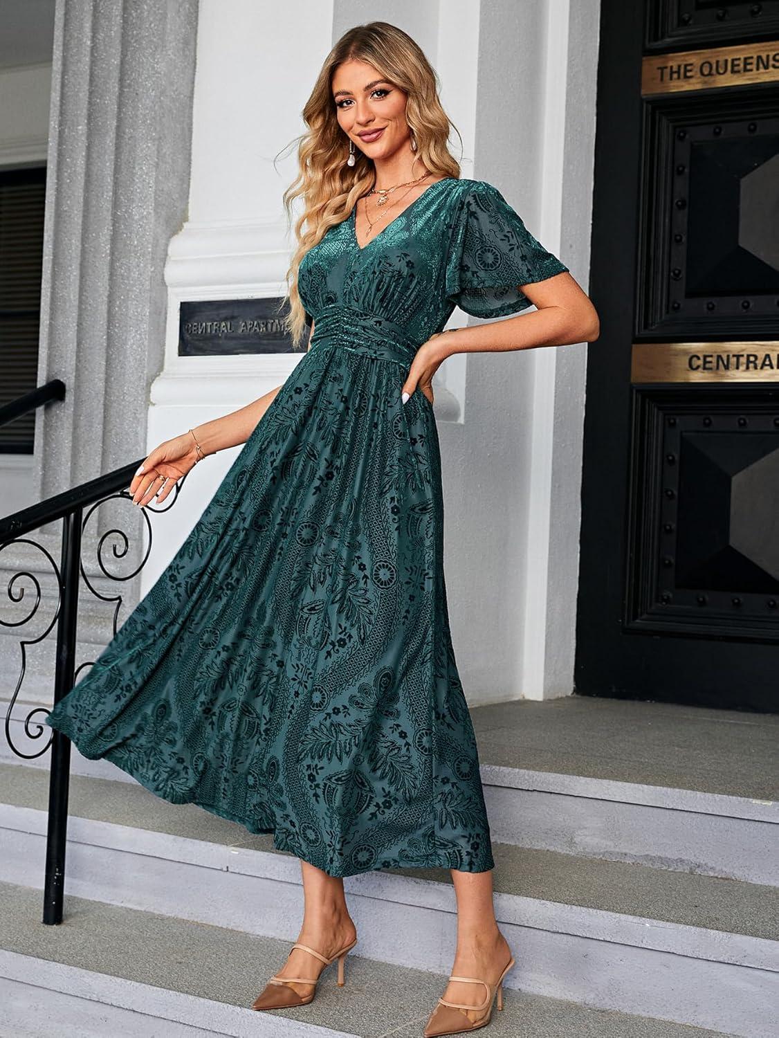 Simplee Women’s V Neck Velvet Maxi Dress Short Sleeve Empire Waist Long Formal Dress for Wedding Guest(4#green Floral)