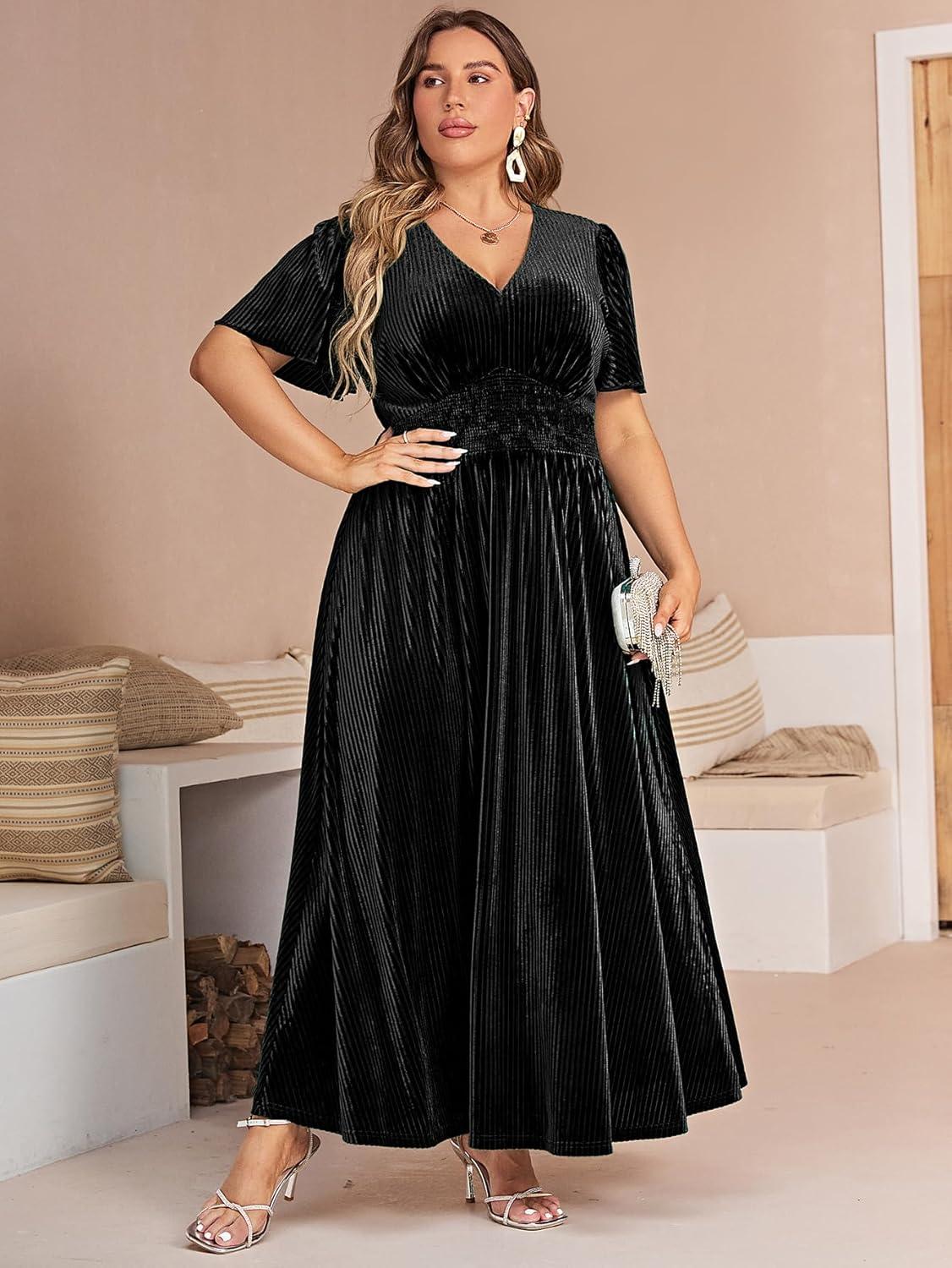 Simplee Women’s V Neck Velvet Maxi Dress Short Sleeve Empire Waist Long Formal Dress for Wedding Guest(P-black)