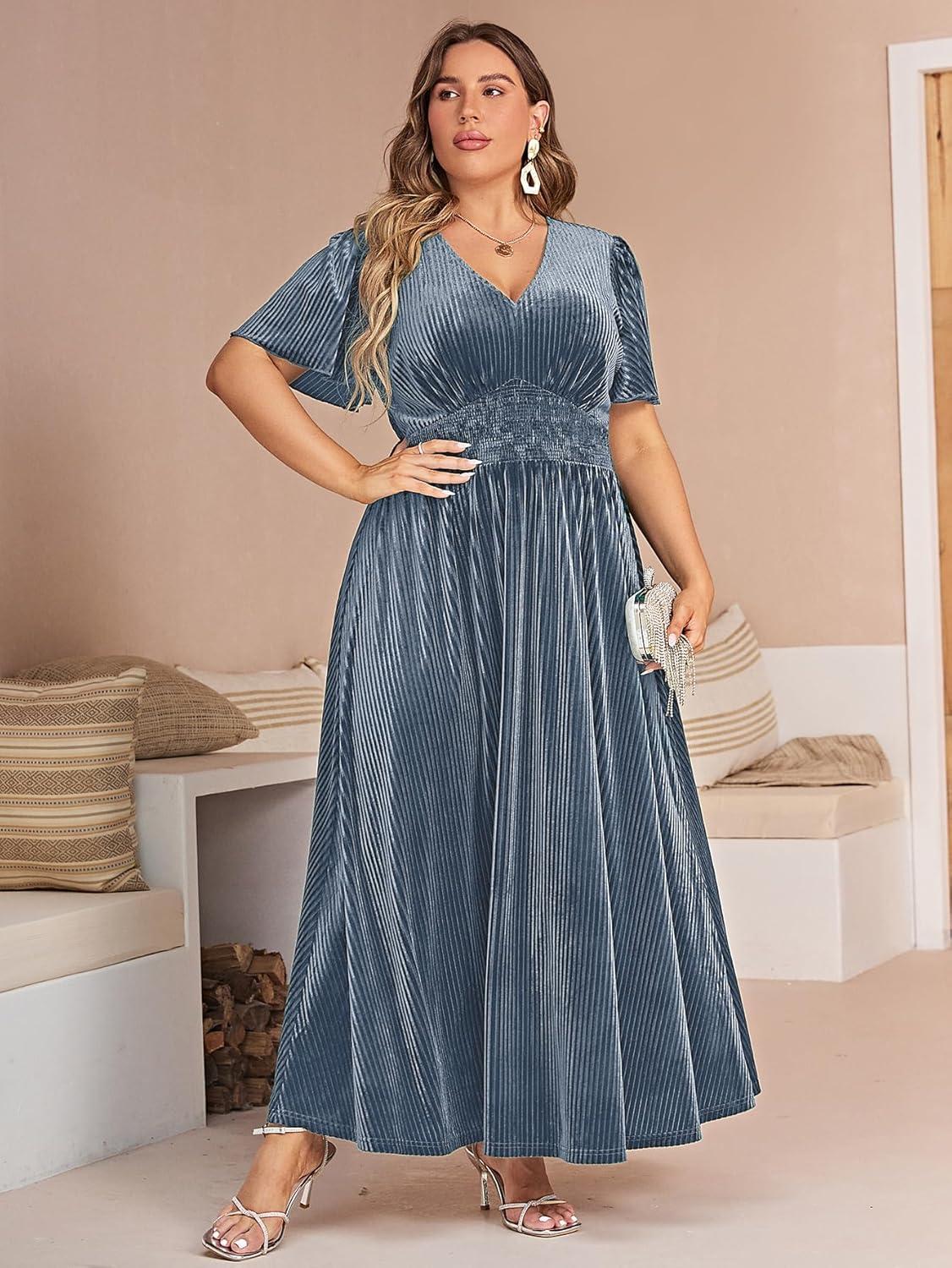 Simplee Women’s V Neck Velvet Maxi Dress Short Sleeve Empire Waist Long Formal Dress for Wedding Guest(P-grey Blue)