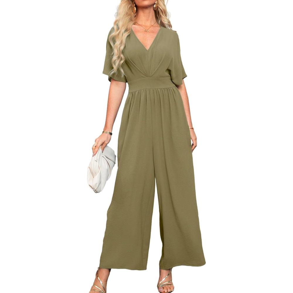 Simplee Women's V Neck Wide Leg Jumpsuits Dressy Casual One Piece High Waist Short Sleeve Formal Jumpsuit Long Romper(Emerald Green)