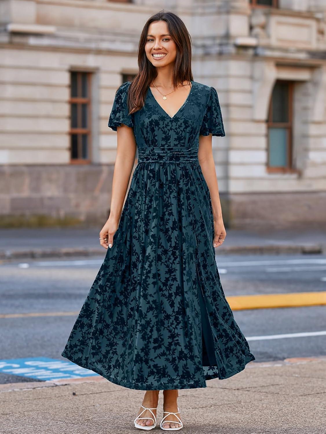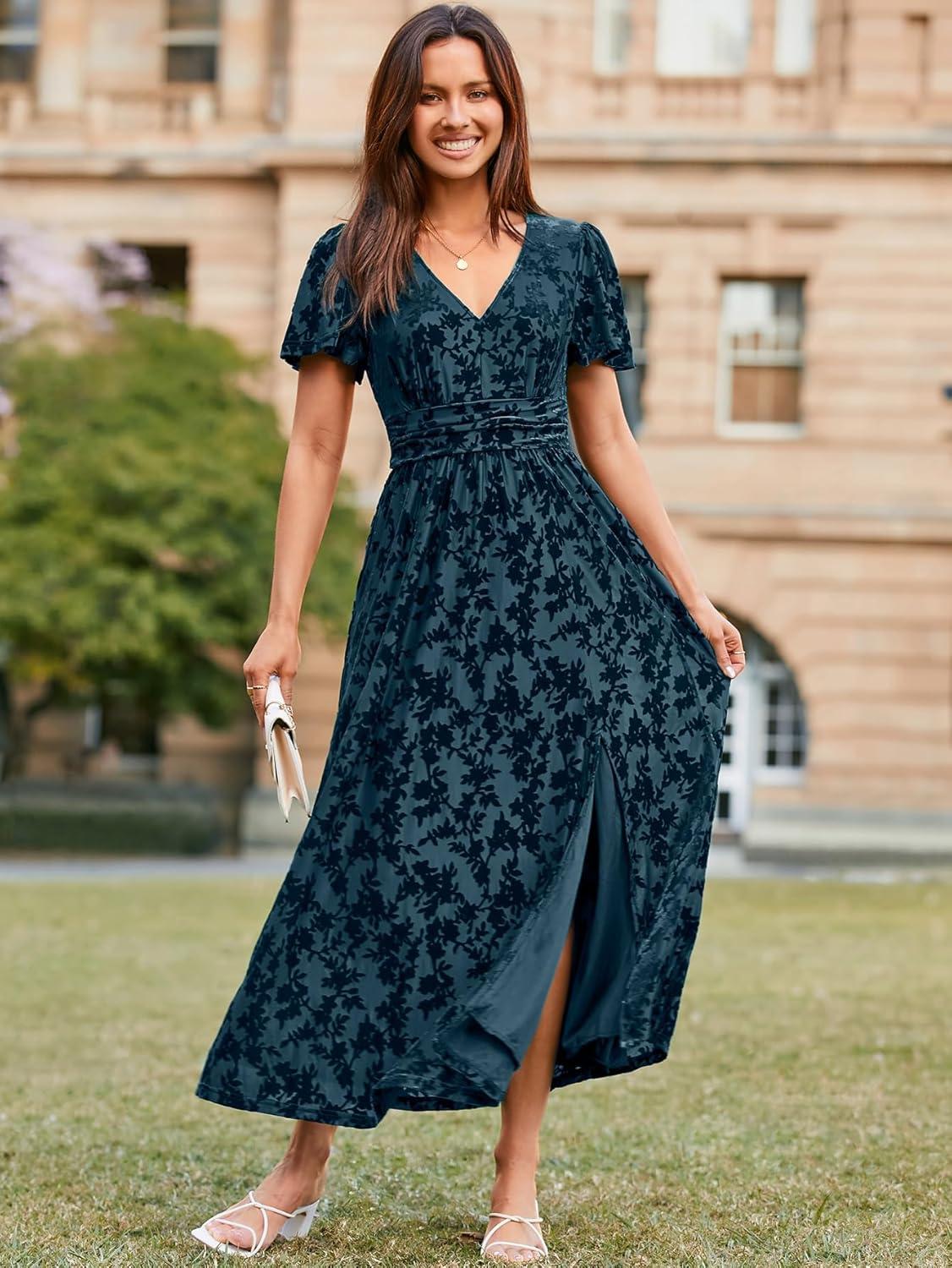 Simplee Women’s Velvet Maxi Dress V Neck Short Sleeve Empire Waist Semi Formal Long Cocktail Dresses(#Burnout-dusty Blue)