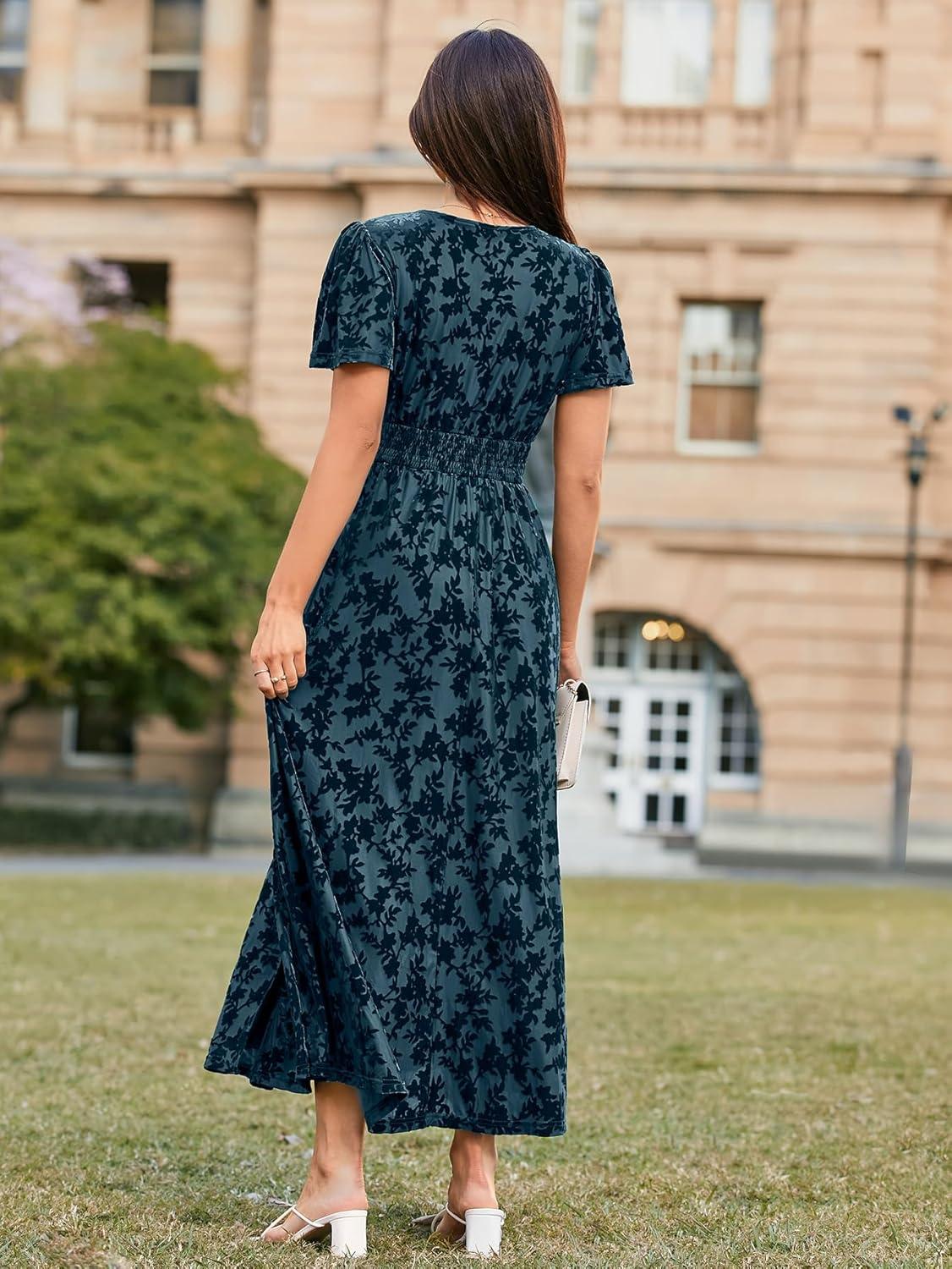 Simplee Women's Velvet Maxi Dress V Neck Short Sleeve Empire Waist Semi Formal Long Cocktail Dresses(#Burnout-dark Blue)