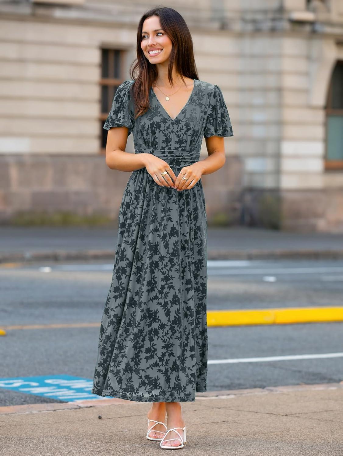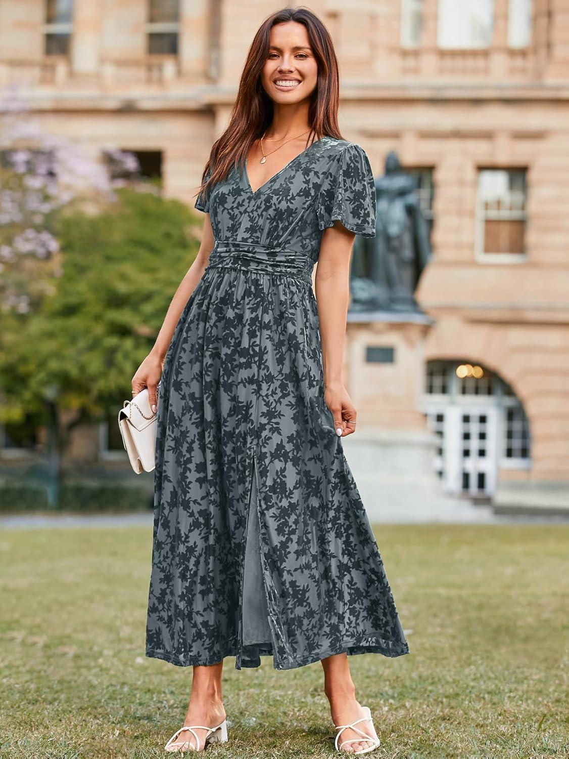 Simplee Women's Velvet Maxi Dress V Neck Short Sleeve Empire Waist Semi Formal Long Cocktail Dresses(#Burnout-dusty Blue)