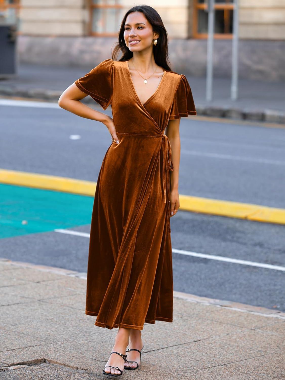 imageSimplee Womens Velvet Wrap Dress Short Sleeve High Split Fall Wedding Guest Dresses Long Formal Cocktail Party DressesOrange